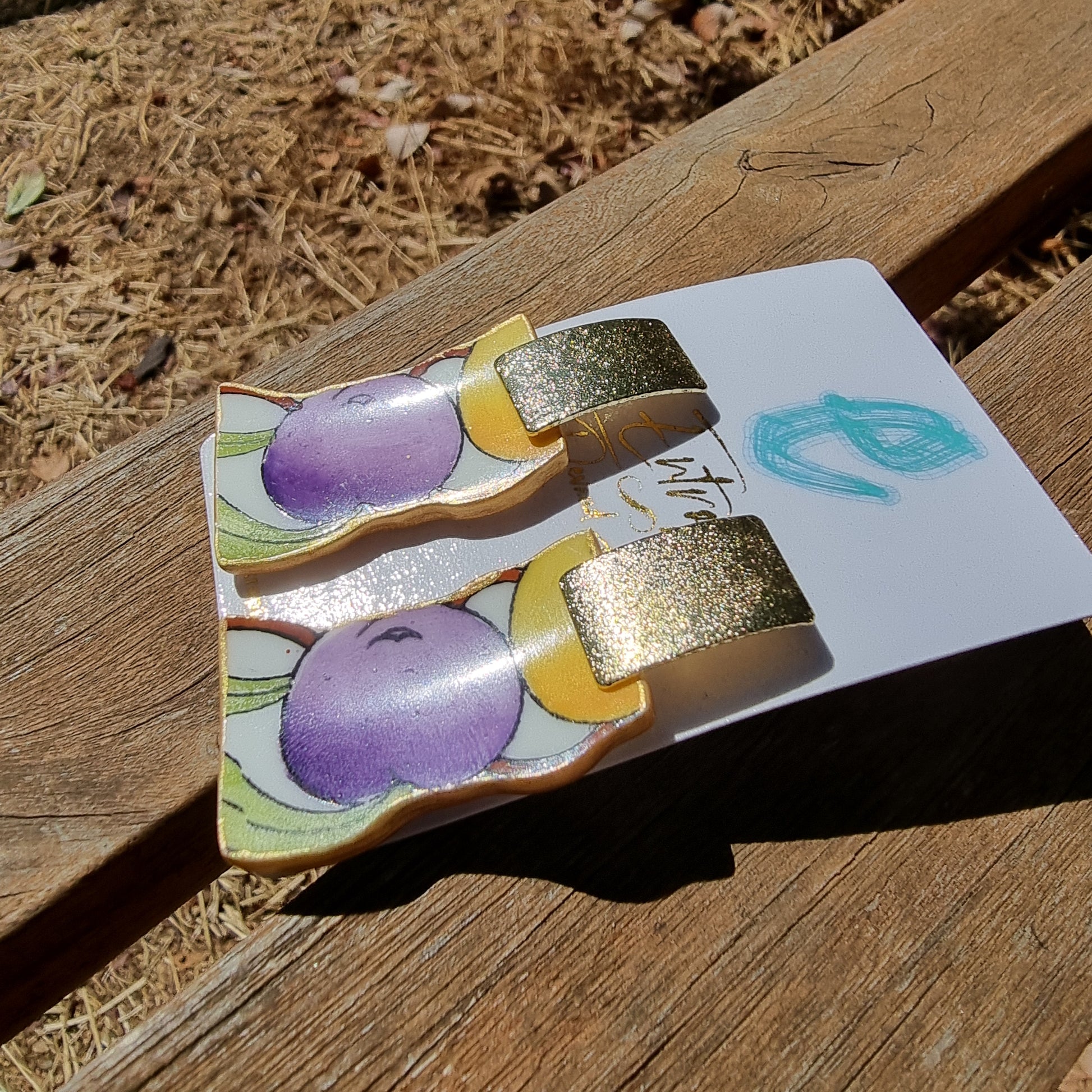 Aretes colgantes, hechos con trozos de porcelana inglesa reutilizada, con diseños frutales y ligeramente contorneados, sellados sus bordes con pigmento dorado.Tienen ganchos de acero, material hipoalergénico y de mucha durabilidad, y sus medidas son 5.5 cms de alto total, por 2 cm de ancho.