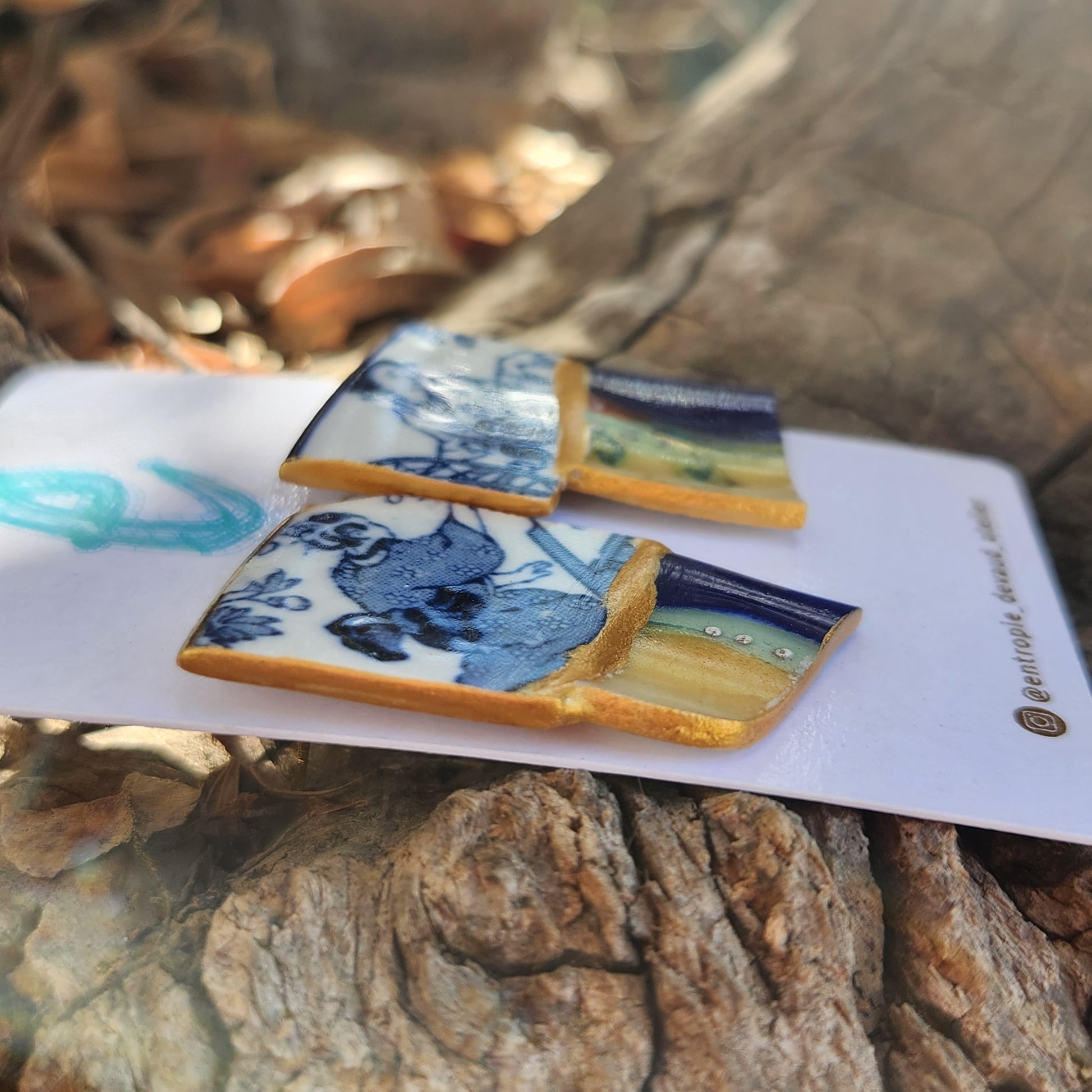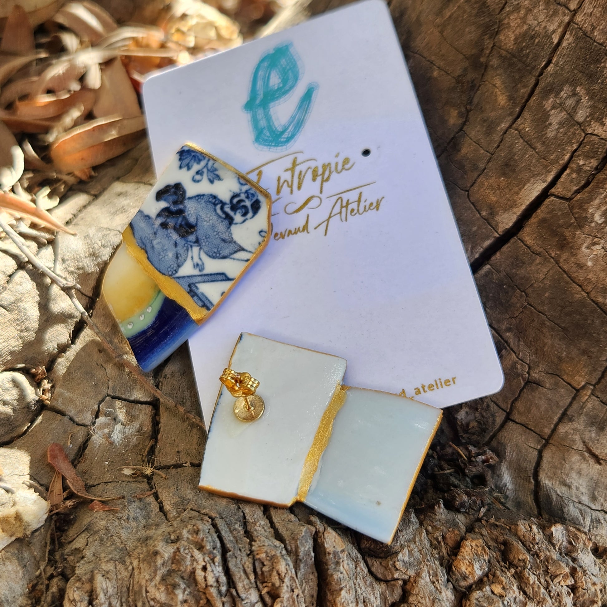 Aros asimétricos, composición hecha con trozos rescatados de porcelana inglesa, diseño oriental, y porcelana japonesa pintada a mano. Se han unido utilizando la técnica inspirada en el kintsugi japonés y sus bordes están sellados con pigmento dorado. Sus pasadores son de plata con baño también dorado.